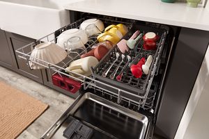 uses over a dozen dedicated wash jets to clean inside coffee mugs and cereal bowls. It also features a removable utensil tray.